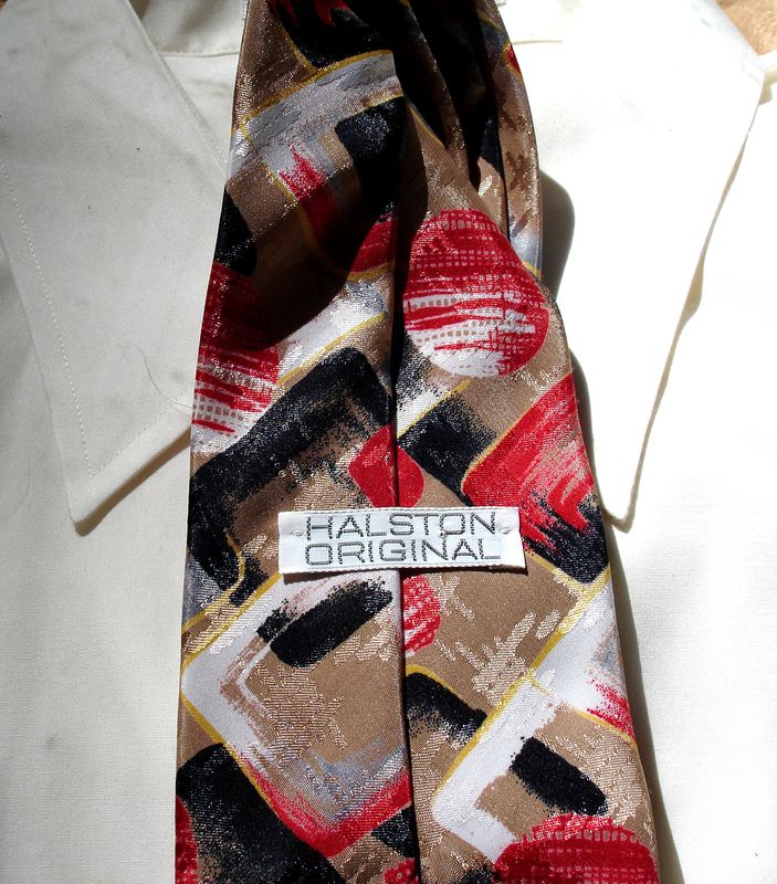 Tie is pre-owned and is in excellent condition with no stains or tears. This Halston Original tie measures approximately 56" tip to tip and approximately 4" across at it widest point. Tie has its original Halston Original label as well as its "Made In USA - Imported Polyester" label.